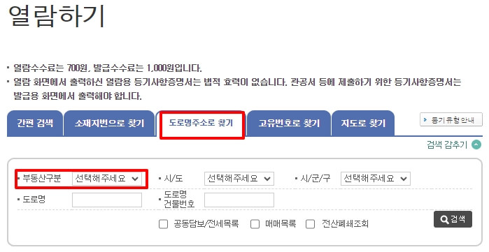 아래처럼 시도, 시군구, 도로명, 건물번호, 동, 호수 까지 입력하셔서 검색, 해당 부동산을 확인후 선택